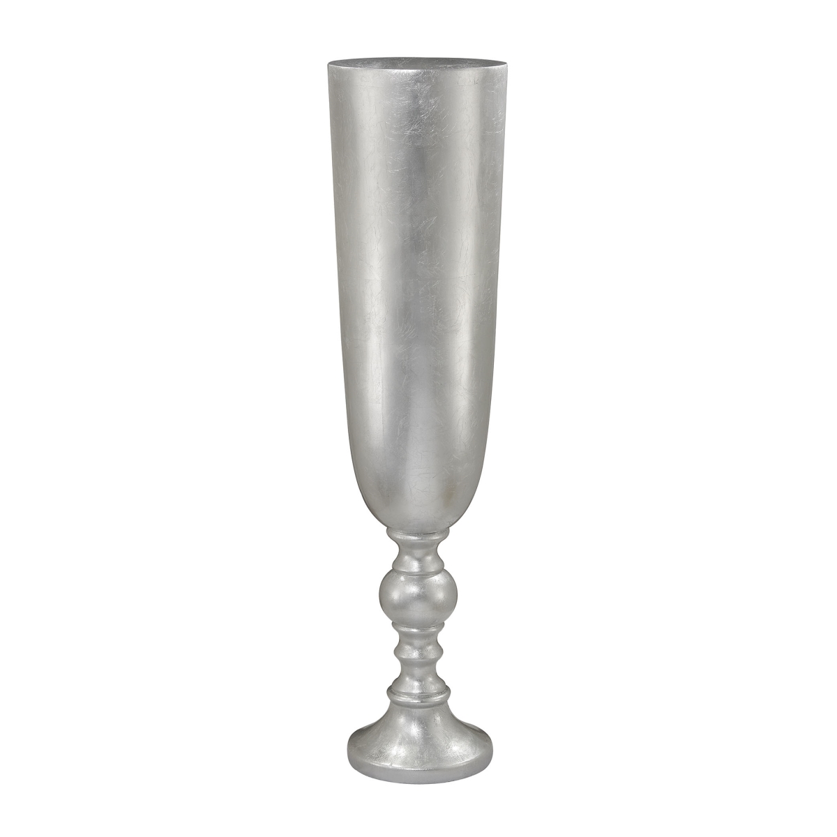 This oversized planter stands 57 in height and is finished in a bright silver leaf finish. Formed from fiber glass it is lightweight and durable.
