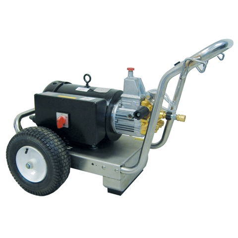 The E300 cold water electric pressure washer producing a powerful 3000 PSI at 3.7 GPM is for industrial and commercial use; perfect for the professional who cleans farm machinery and animal pens removes asbestos from buildings washes vehicles or heavy equipment; maintains a factory or food processing plant. There scores of electric powered pressure washers to choose from but the E300 is unique amongst gas pressure washers in four ways. 1) It features the unique Kranzle pump that can run dry and bypass better than its rivals as proven in independent laboratory tests self primes and is freeze proof. 2) It uses a low RPM Total Enclosed Fan Cooled Baldor 220 volt 35 amp single phase electric motor designed for hard industrial use. 3) The strong stainless steel frame will hold up to the toughest field conditions and still look like new. 4) The pressure washer includes the Industrial Dirt Killer turbo nozzle powerful enough to cut a 2" x 4" piece of lumber in half in a matter of seconds. The E300 comes with all the accessories you need to clean to include: professional gun-jet lance 50' wire braided hose with quick coupler connections exit side chemical injection gauge four flat tip nozzle set (0 degree 15 degree 40 degree soap) and for difficult to clean dirt a hard hitting Industrial Dirt Killer turbo nozzle. With a cleaning power rating of 11100 cleaning units the E300 cold water electric pressure washer provides a tremendous amount of cleaning power for the industrial or agricultural user.