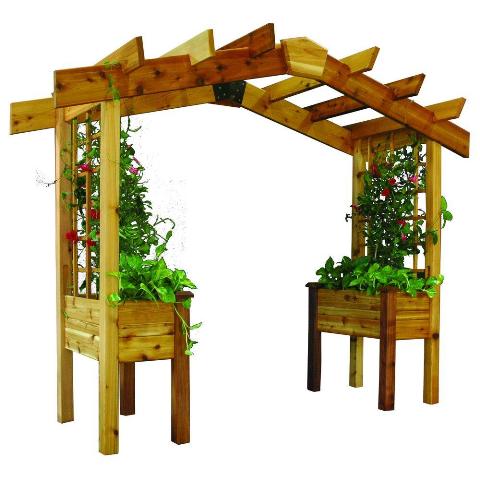 This sturdy pergola can be used as a garden/patio entrance feature area on a concrete slab and it also makes a wonderful trellis for climbing plants. Plant your choice of veggies colorful plants or flowers in the planters to enhance the look.