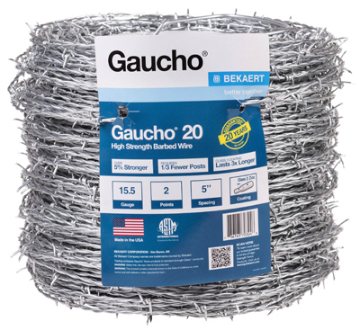 Gaucho 20 1320' High Strength Barbed Wire 15.5G 2 Point 5 Spacing Class 3 Made Of High Strength Steel Wire Can Use A Smaller Diameter Wire While Maintaining The Same Strength As Standard Strength Barbed Wire Reverse Twist Design Reduces Sagging Eliminates The Need For Pre-Stretching & Allows For Increased Post Spacing All Of Which Will Save You Time Money & Maintenance Headaches Great For Cattle & Exclusion Purposes.