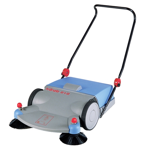 KranzleUSA push sweeper sweeps flat hard surfaces quickly both inside and out: warehouses parking lots sideways and streets. Four rotating brushes are powered by the wheels as a person pushes the sweeper. The two curb brushes capture dirt on the edges and push it to the center where two contra-rotating brushes underneath scoop the dirt into the refuse bin. Filters keep dust from coming out of the bin. Push faster and the brushes turn faster making sweeping more effective. With a cleaning width of 31-1/2-inches you can sweep 37000 square feet per hour at a moderate pace. The 9 gallon refuse bin lifts off for easy disposal. This sweeper can picks up paper bottles cans and dust - even water.