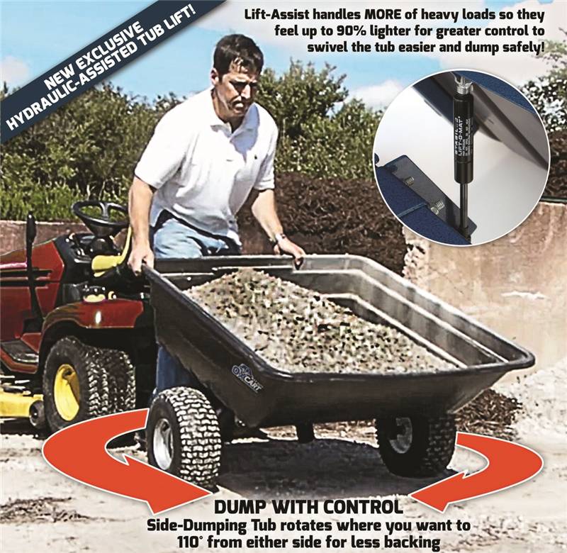 Take less trips - load tested to 1100 lbs. Professional-grade all-square-tube frame. Handle heavy loads easy. The new Hydraulic Lift-Assist makes lifting of heavy loads to Swivel and dump safely. Tub rotates 55 degrees to either side. No more flats - Run-Flat tractor-grade tires self-seal most punctures instantly before losing any air - $100 value. Assembles in only 10-15 minutes. Attaches to any mower ZTR or ATV with a pin-hole hitch. Great 4-season cart to upsell with land and game-prep material orders.